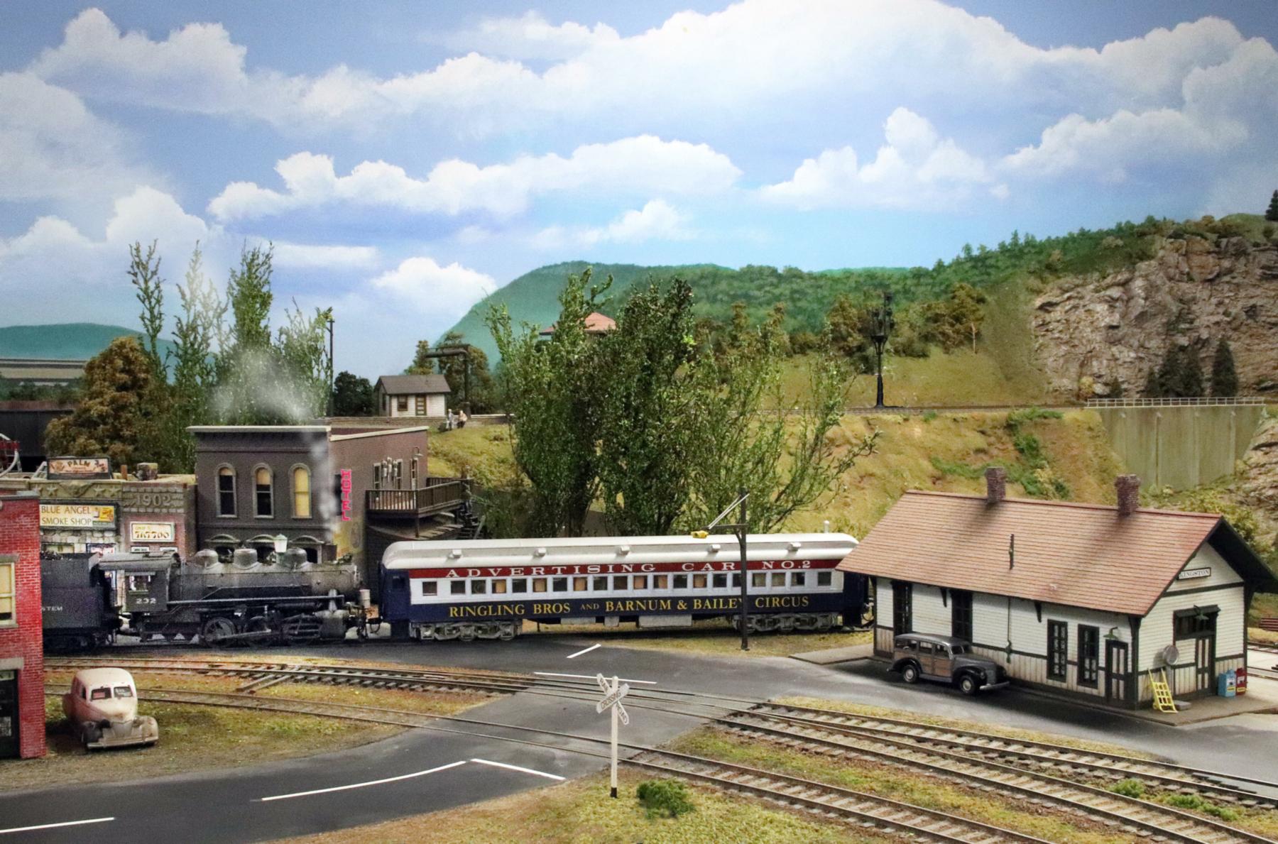 The circus is coming to town! The 0-6-0 NYC Switcher #232 is spotting the Ringling Brothers Circus advertising car #2 on the team track of the town where the circus will soon perform. The locomotive was made by Boo-Rim Precision, Korea and imported by River Raisin Models. The advertising car is an American Models coach car, which was custom-painted, decaled, and fitted with a detailed interior. The structures are from a variety of kits. Circus trains were a unique and colorful experience for everyone. Two weeks prior to their arrival, the advertising car came to town filled with posters, complimentary tickets, signs, and all kinds of promotional materials. Every vacant square foot of space was soon covered with a poster or sign, local politicians were given free tickets, retail merchants displayed circus-related materials in their shop windows, and so forth. The excitement was stimulated to a fever-pitch culminating in a parade once the circus train itself arrived. Advertising cars were typically parked on any convenient siding near the downtown area. This photo appeared in the inside cover of the November 2024 issue of the Railroad Model Craftsman magazine as part of the NASG's promotional ad campaign.