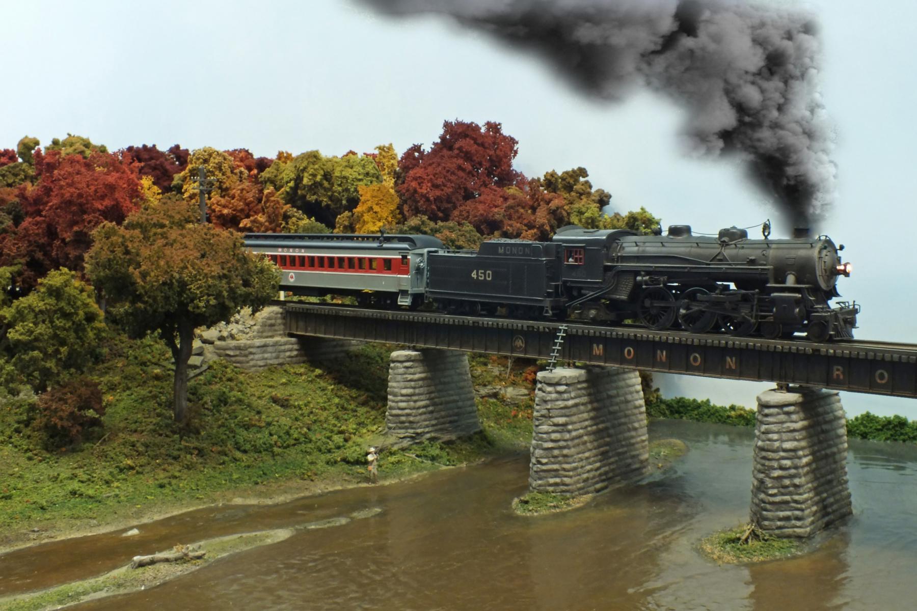 Number 281 approaches the White River Bridge just south of Gosport, Indiana. The engine is a Southwind Models brass UP 2-8-0 with an Overland Models USRA tender. Both the engine and tender have had substantial changes applied to "Mononize" them. The cut stone is plaster, cast in molds made with Slater's "Plastikard" for a pattern. The bridge girders are sold as HO-scale.