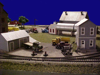 The track on this layout is S-Helper Service sectional track with some of their flextrack at the end of some sidings so that Terry could get it "down in the weeds". This view shows the cast-resin buildings, all made from the 7 basic wall molds. Roofs were made of Plastruct roof sheets. The trucks are all Hartoy trucks, which Terry modified to make look far different from how they did originally. The cars are a Matchbox 1932 Ford coupe and a 1927 Ford pickup. These are "Hot Rods", which have been "de-tuned" by removing the headers and adding card stock hood sides, then repainting them in original early-Ford colors. Their "Mag" wheels were covered with discs of card stock and painted appropriately.