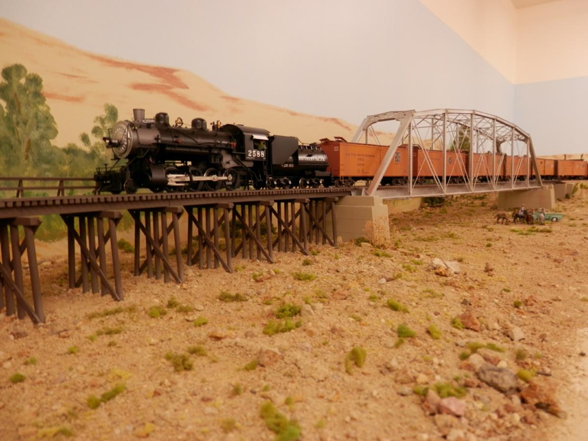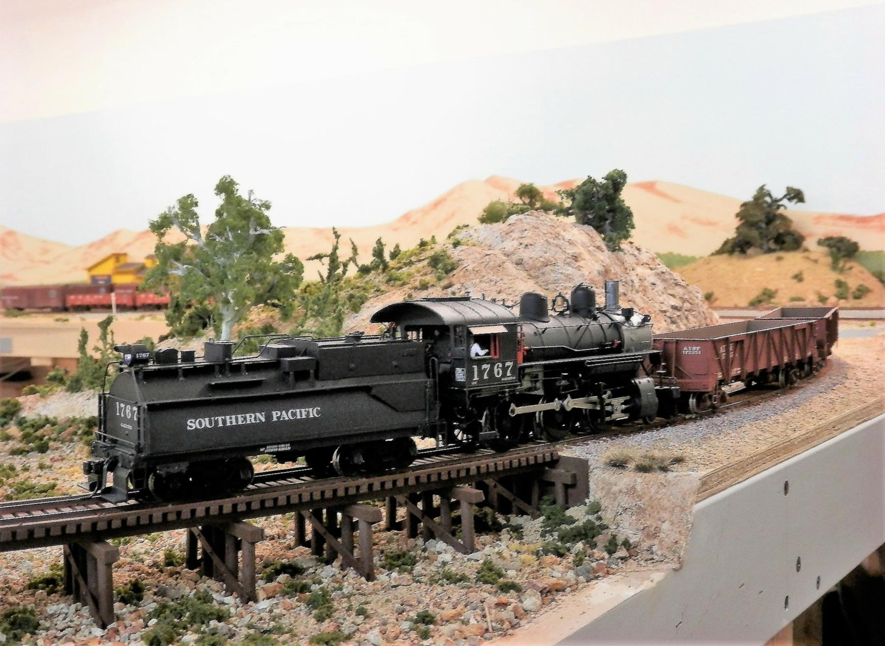 Number 2914 drifts past Copeland Feed and the two-headed oak tree on the hill, with a manifest of empties heading for the barn. The locomotive is a Southern Pacific TW-8 class twelve-wheeler (a 4-8-0) that was scratch-built by Paul. The prototype still exist at Pioneer Village at the Kern County Museum in Bakersfield, California. The stock car is a East West Rail Service SP S-40-2 kit that Paul built. The switch stand is a product by Rio Grande Models (part #3356).