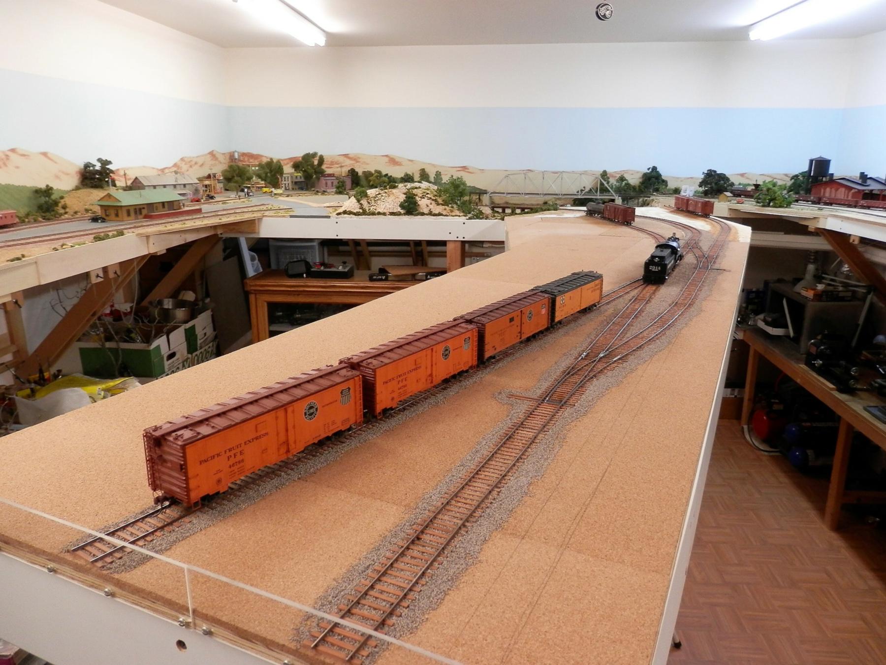 The remainder of the peninsula is still under construction. Track work has been completed. Paul uses Del-Aire components to control his turnouts. This photo also shows the layout room from one angle.