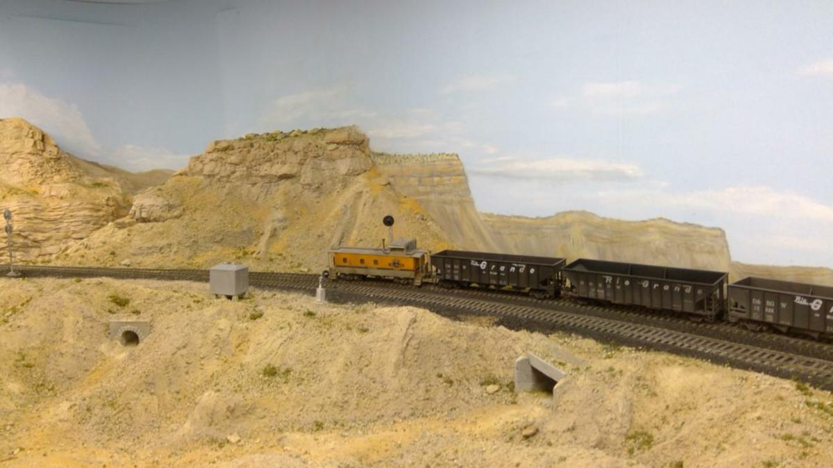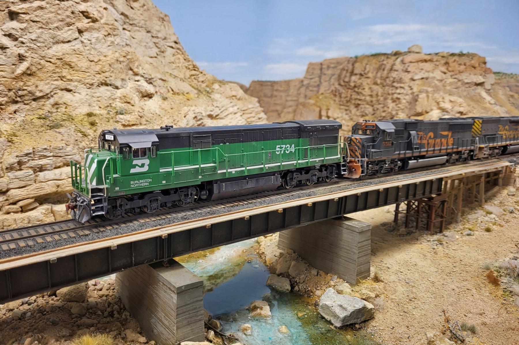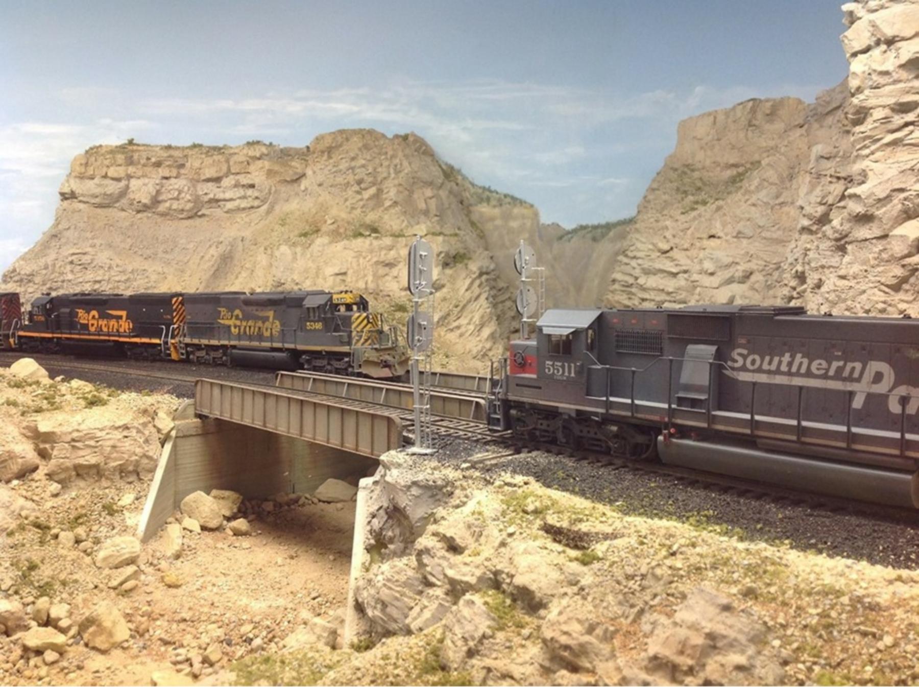 UP SD70ACe Heritage unit #1989 crosses Price River at Castle Gate just west of Helper, Utah. A ubiquitous Rio Grande Tunnel Motor (SD40-2T) trails. The 1989 is a reworked Lionel SD70ACe. The pilot was removed from the trucks and screwed into the frame. The pilot openings were filled in and Kadee couplers installed. A light weathering was applied. The trailing SD40-2T is an Overland Models brass import with added details and custom paint, and DCC sound and lights installed. The Southern Pacific box car is an S Scale America model of an FMC double-door box car, which has also been lightly weathered. Track is code 100 by Custom Trax. The track ballast was special ordered (N-scale Woodland Scenics cinders) for the track to reflect the Rio Grande's use of slag and cinders from the Geneva Steel mill at Provo, Utah. The signals were produced by South Bend Signal Company (out of business) and are used to indicate turnout position only. The bridges are Central Valley HO-scale plate girders, and the bridge abutments are Chooch (also HO-scale). Scenery is hardshell gypsolite with dental plaster rock castings. The stream is EnviroTex Lite® shaded blue/green with Alclad paint. The photo was taken using a Samsung cellphone. Craig's photo appeared on the inside cover of the September 2022 and July 2025 issues of Railroad Model Craftsman in the NASG promotional ad campaign.